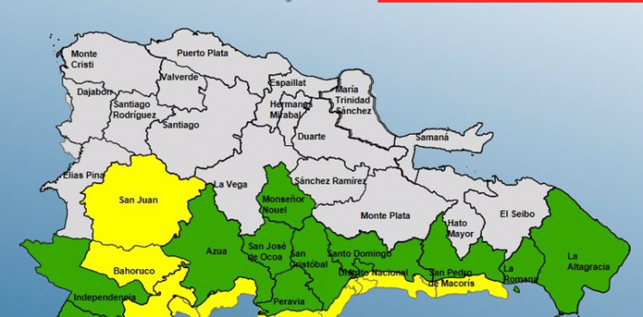 Las provincias en a lerta amarilla son San Juan, Bahoruco y Barahona.Mientras que en verde estan Monseñor Nouel, Peravia, Azua, Santo Domingo, San Pedro de Macorís, La Romana, Pedernales, San Cristóbal, Ocoa, Independencia, La Altagracia y el Distrito Nacional.