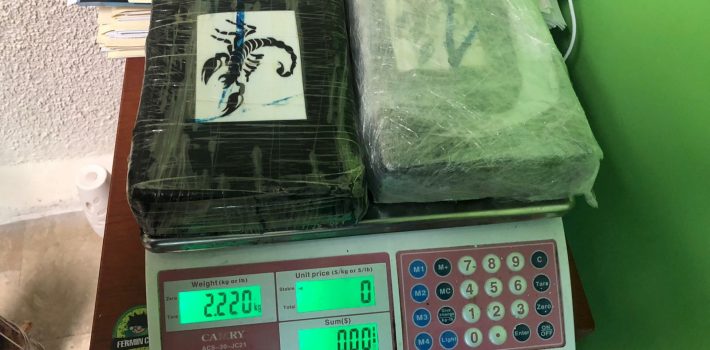 Al inspeccionar el equipaje del extranjero, las autoridades incautaron envueltos en fundas plásticas y prendas de vestir, dos paquetes de un polvo que se presume es cocaína.
