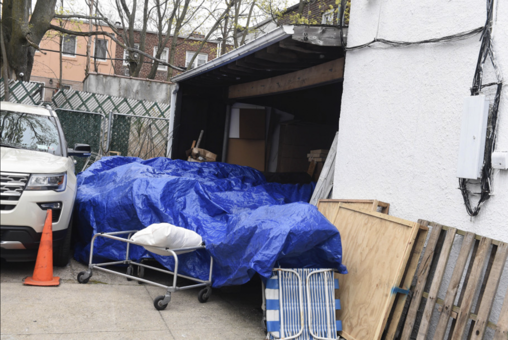 Los vecinos se sorprendieron al ver cuerpos sin refrigerar que quedaron debajo de una lona azul en el English Brothers Funeral Home en Brooklyn.