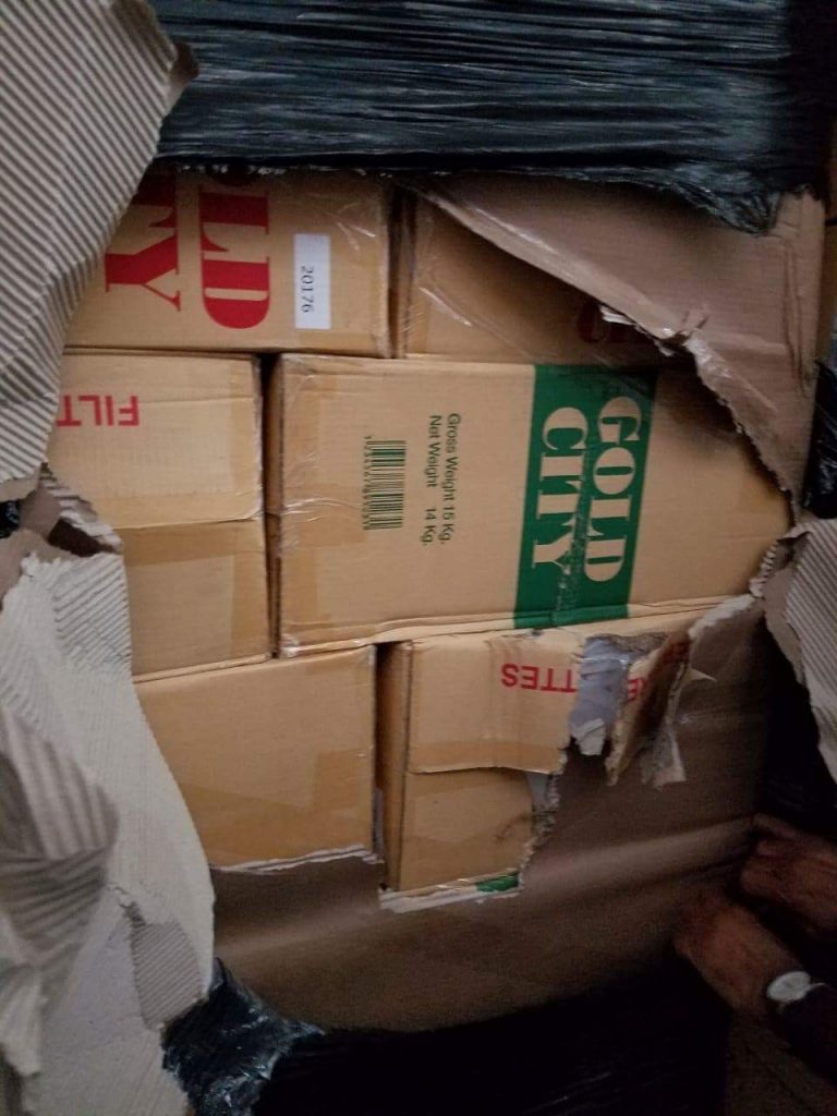 Dentro de las mercancías objeto de contrabando, se encontraron en el depósito de E.T. Heinsen, en el contenedor TGHU0708614, tres (3) paletas de cigarrillos que contenían 96 cajas de 10 mil unidades de cigarrillos cada una, de las marcas Gold City Mentol y Gold City Rojo, para un total de 960 mil unidades.
