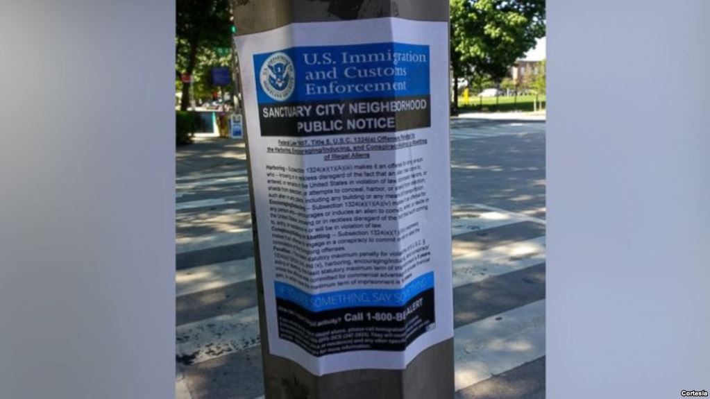 Los volantes en los cuales se lee que son una notificación de ICE sobre el estatus de Washington DC como ciudad santuario, informan a los residentes que deben reportar a los inmigrantes indocumentados y advierten que hay prisión para aquellas personas que contraten o ayuden a un inmigrante sin estatus legal.