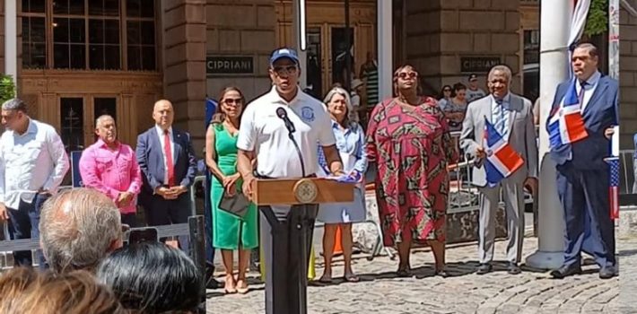 NUEVA YORK.- En un acto en el que una vez más el alcalde Eric Adams resaltó la laboriosidad y contribuciones de la comunidad dominicana en esta ciudad, este lunes fue izada la bandera quisqueyana en el distrito económico de Manhattan, específicamente en la plaza de Bowling Green.