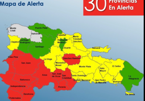 En alerta amarilla se encuentran Santo Domingo, Distrito Nacional, Dajabón, La Vega, María Trinidad Sánchez, Hato Mayor, San Pedro de Macorís, Monseñor Nouel, Espaillat, Monte Plata, Samaná, El Seibo, La Romana y Duarte. Mientras que Hermanas Mirabal, Santiago Rodríguez, Puerto Plata, Santiago y La Altagracia se encuentran bajo alerta verde.