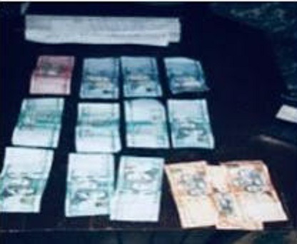 Al detenido se le ocuparon tres billetes de dos mil pesos, una de mil y seis de quinientos, todas falsas, además de la suma de ocho mil pesos en efectivo, en billetes no falsos y la motocicleta marca Gato, modelo CG-200, color negro, placa K0504794, con el numero de su chasis ilegible, por lo que será puesto a disposición de la justicia para los fines de ley correspondiente.