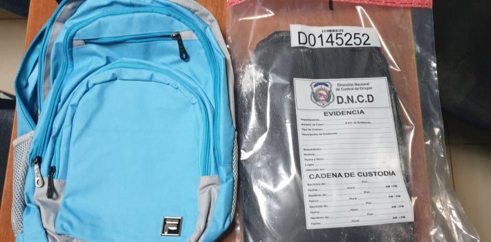 Los agentes de la DNCD y miembros de agencias de inteligencia, procedieron a inspeccionar el equipaje, encontrando una mochila con un doble fondo, donde se incautó una lámina con un peso preliminar de 2.83 kilogramos, de un polvo que aparenta ser cocaína.