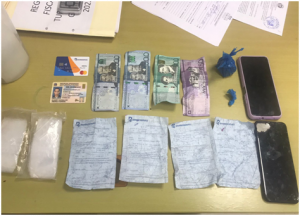 Durante la pesquisa, donde fue detenido Gilbert Garibaldis Jiménez Cabrera, las autoridades policiales y del Ministerio Público confiscaron sendas porciones de un polvo blanco y de un vegetal verde, presumiblemente cocaína y marihuana, además, la suma de cuatro mil quinientos cincuenta pesos en efectivo y dos celulares, entre otros objetos.