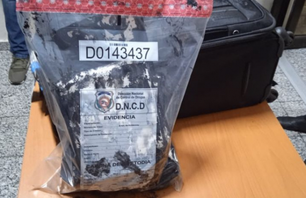 Posteriormente y en presencia de un fiscal, se procedió a realizar una inspección más rigurosa, descubriendo en la maleta un doble fondo, con seis láminas de una sustancia que se presume es cocaína, con un peso preliminar de 3.35 kilogramos.