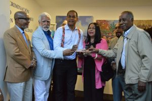 La placa fue entregada por los consagrados artistas Rosa Tavárez, Freddy Javier, Alberto Bass, Junior Reyes Ocre, por los expresidentes del CODAV Antonio Guadalupe y Clinton López y el crítico de arte Abil Peralta, este lunes 30 de abril en el stand del senador Valentín.