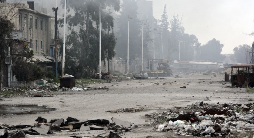 In this photo released by the Syrian official news agency SANA, damaged and blocked street where clashes erupted between the Syrian government forces and rebels, near the Abbassiyin square, east Damascus, Syria, Monday March 20, 2017. Syrian government forces on Monday regained control of parts of Damascus that were attacked and captured by rebels and militants the previous day, with the two-day fighting leaving dozens dead on both sides, the military and an activist group said. (SANA via AP)