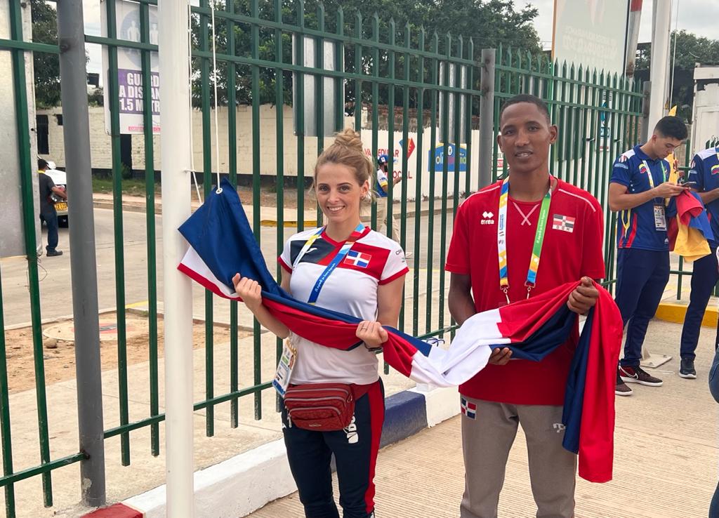VALLEDUPAR.- Los atletas María Dimitrova y Alexy de la Cruz izaron el lienzo nacional en lo que fue la ceremonia de elevación de banderas de los 11 paíeses que compiten en los XIX Juegos Bolivarianos que tienen lugar en Valledupar, Colombia.