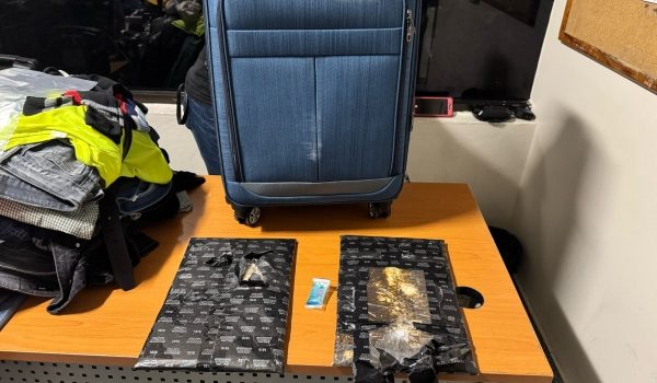 Por instrucciones del fiscal actuante, se abrió el equipaje, descubriendo un doble fondo, con dos paquetes (en forma de láminas), presumiblemente cocaína, envueltos en papel carbón, con un peso aproximado de 2.5 kilogramos.