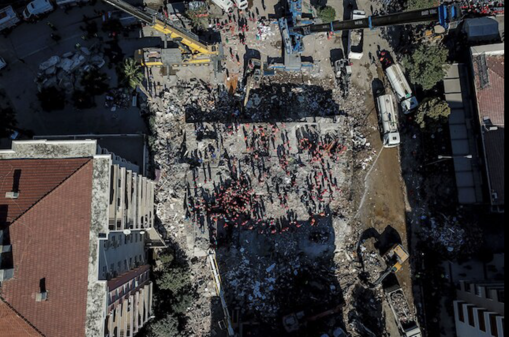 Vista aérea tomada el 1 de noviembre de 2020, muestra voluntarios y rescatistas buscando sobrevivientes en un edificio colapsado en Esmirna, Turquía