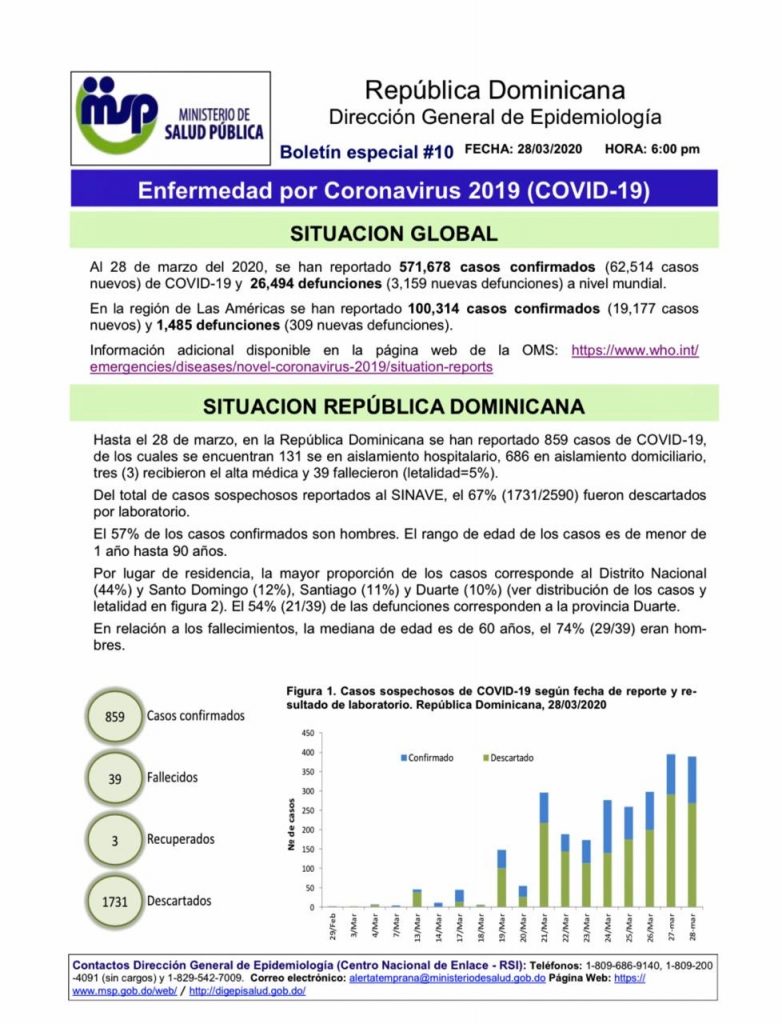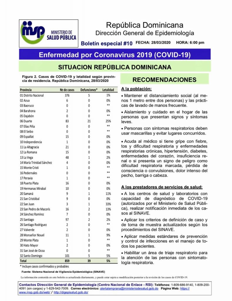 Santo Domingo.-El ministro de Salud Pública, doctor Rafael Sánchez Cardenas, confirmó este domingo que el número de casos de coronavirus se elevó a 859 y 39 el número de fallecido.