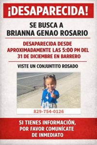 Puerto Plata,-Autoridades de seguridad y rescate permanecen desplegadas en la comunidad de Barrero, en el municipio de Imbert, provincia Puerto Plata, tras la desaparición de la menor Brianna Genao Rosario, de apenas 3 años. La niña fue vista por última vez el 31 de diciembre, vestida con un conjunto rosado.