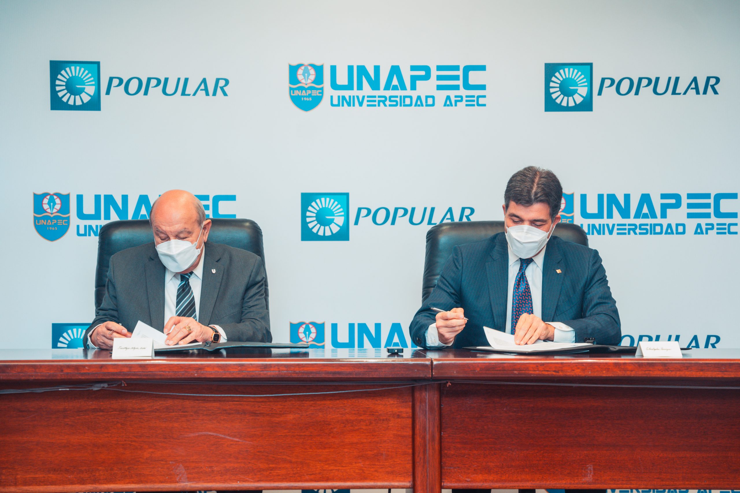 Santo Domingo, D.N. – El Banco Popular Dominicano y la Universidad APEC (UNAPEC) firmaron un acuerdo de colaboración para integrar a esta alta casa de estudios en el programa de becas Excelencia Popular, el más amplio del sector financiero, otorgando cinco becas universitarias o de nivel técnico superior a estudiantes meritorios que decidan cursar estudios en esta universidad.