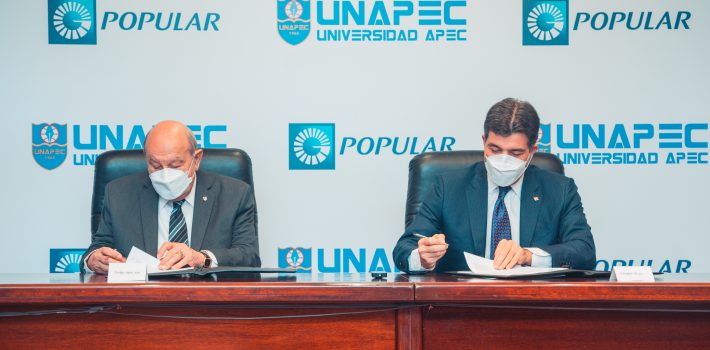 Santo Domingo, D.N. – El Banco Popular Dominicano y la Universidad APEC (UNAPEC) firmaron un acuerdo de colaboración para integrar a esta alta casa de estudios en el programa de becas Excelencia Popular, el más amplio del sector financiero, otorgando cinco becas universitarias o de nivel técnico superior a estudiantes meritorios que decidan cursar estudios en esta universidad.