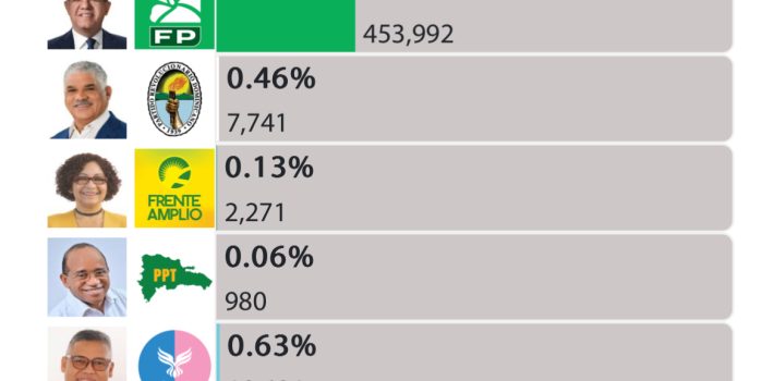 El boletín también incluye a otros candidatos. Fulgencio Severino, del partido Patria para Todos, cuenta con un 0.06%. Severino es cardiólogo y escritor. Miguel Vargas, del Partido Revolucionario Dominicano, tiene un 0.44%, y es ingeniero, empresario y político. Carlos Peña, del partido Generación de Servidores (GENS), obtiene un 0.64% y es pastor. Roque Espaillat, del Partido Esperanza Democrática, conocido como «El Cobrador» y también médico, tiene un 1.40%.