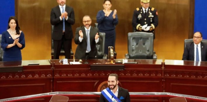 El discurso del mandatario fue interrumpido varias veces por sus simpatizantes, que ocuparon la segunda planta de la sala y gritaban “Nayib, amigo, el pueblo está contigo”.