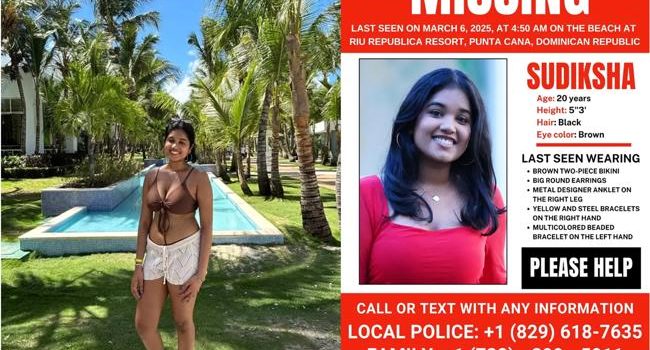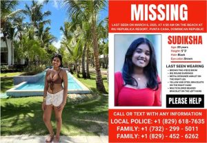 NUEVA YORK,- La estudiante de origen indígena,Sudiksha Konanki desaparecida en Punta Cana, República Dominicana es buscada por tierra, aire y mar incluyendo drones y perros entrenados, mientras la diplomacia india en Estados Unidos se ha unido a la búsqueda.