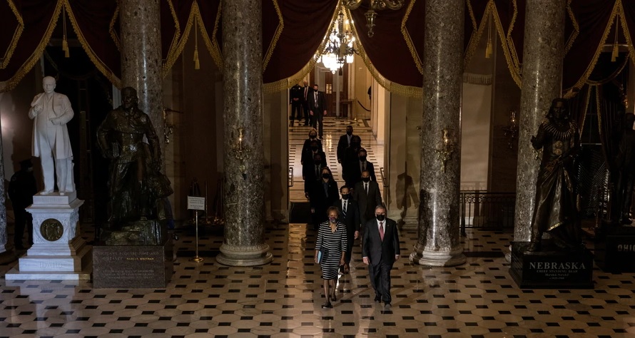 Una ceremonia similar se llevó a cabo para el primer juicio político de Trump en enero pasado, cuando el secretario de la Cámara lideró una pequeña procesión de legisladores a través del Capitolio.