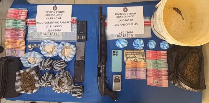 Durante las intervenciones, realizadas en la calle Bellón del sector Hoyo de Friusa y la localidad de la Ceiba, los agentes y fiscales, arrestaron por separado a dos individuos, a quienes ocupó 672 gramos de presunta cocaína, 1, 528 de marihuana y varias porciones de un material rocoso, que aparenta ser de crack, con un peso aproximado de 516 gramos.