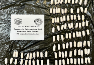 Santo Domingo.-Agentes de la Dirección Nacional de Control de Drogas (DNCD) y miembros del Cuerpo Especializado de Seguridad Aeroportuaria, coordinados por miembros del Ministerio Público, en el marco de la ampliación de los operativos en contra del narcotráfico, arrestaron a un hombre con 99 bolsitas presumiblemente cocaína, en el Aeropuerto Internacional de las Américas, JFPG.