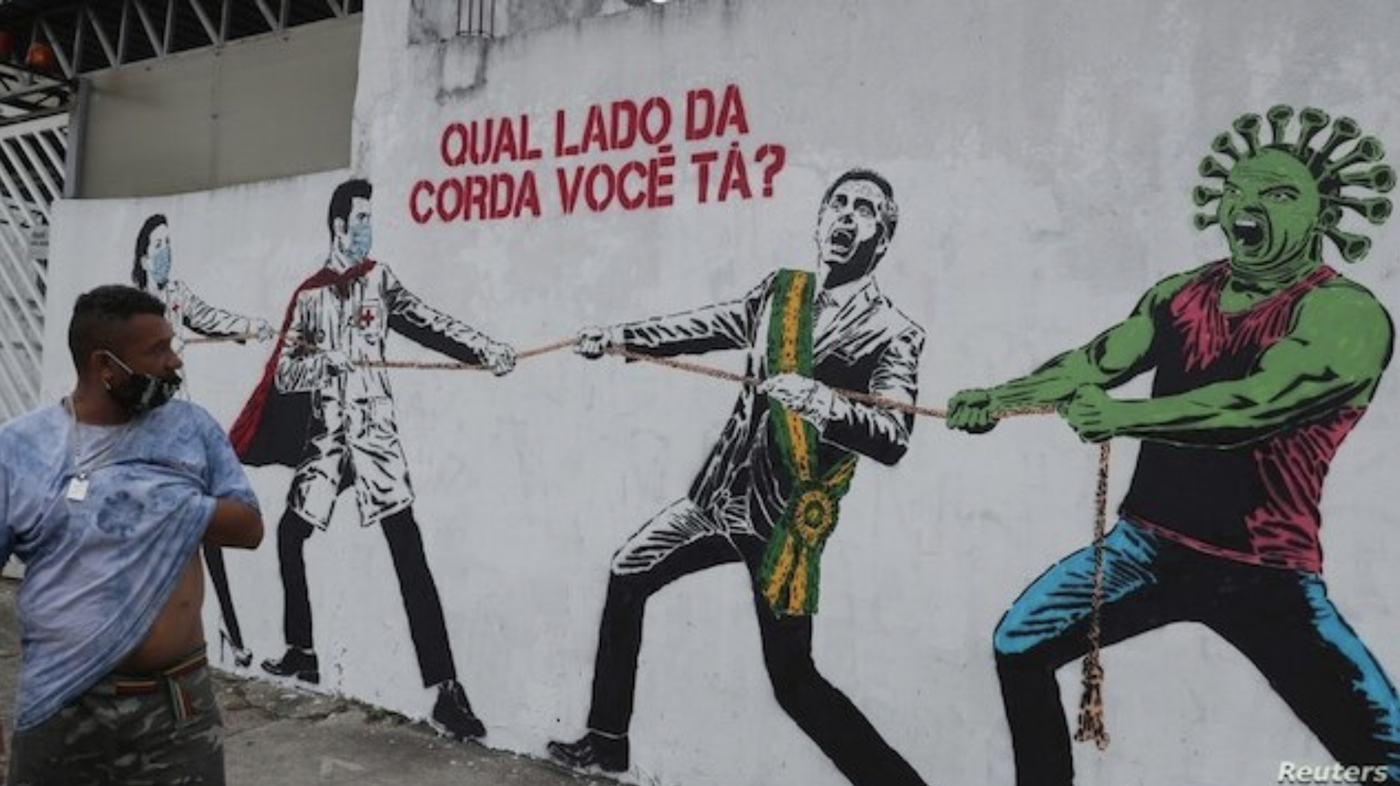 Un hombre pasa frente a un grafitti en que aparecen representados el presidente Jair Bolsonaro