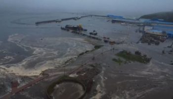 Imágenes captadas por dron muestran cómo un tsunami inunda la ciudad de...