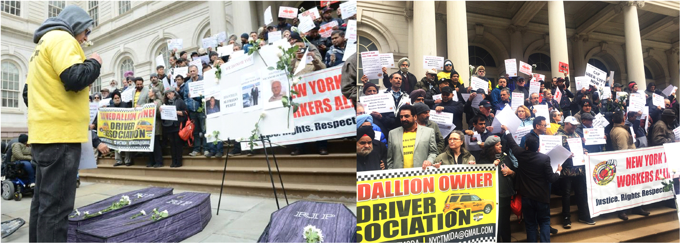 NUEVA YORK,-Cientos de taxistas livery y con medallón, se movilizaron ayer miércoles en las escalinatas de la alcaldía, exhibiendo cuatro ataúdes que simbolizan los suicidios de igual número de choferes, entre ellos los dominicanos Alfredo Pérez y Danilo Corporán, el primero se ahorcó y el segundo, se tiró de la azotea del edificio donde vivía en la calle 135 en el Alto Manhattan, abrumados por las deudas, multas y persecución de las autoridades.