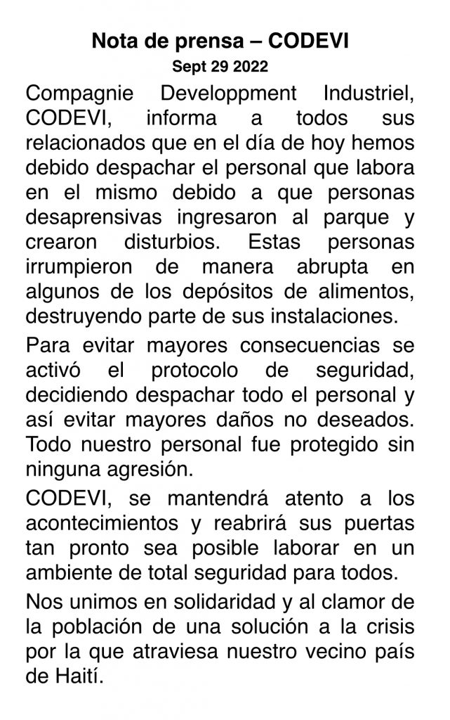 Compagnie developpment Industriel, CODEVI, informó a todos sus relacionados que en el día de hoy despachó a su personal debido a que personas desaprensivas ingresaron al parque y crearon disturbios.