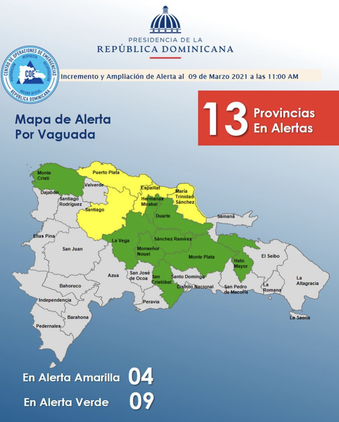 Mientras que en alerta verde están La Vega, Monseñor Nouel, San Cristobal Hermanas Mirabal, Montecristi, Hato Mayor, Duarte y Sánchez Ramírez.