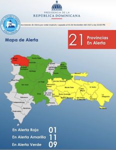 En tanto, en alerta verde se mantiene Santiago, La Vega, María Trinidad Sánchez, Azua, Duarte, San Juan, Santiago Rodríguez, Valverde, Puerto Plata.