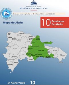 Las provincias en alerta verde Monte Plata, Sánchez Ramírez, San José de Ocoa, Monseñor Nouel, Gran Santo Domingo, Duarte, San Cristóbal, María Trinidad Sánchez, San Pedro de Macorís y Samaná.