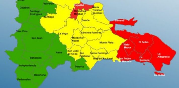 Las provincias en alerta roja son: Hato Mayor, San Pedro de Macorís, La Romana, La Altagracia, Espaillat, Samaná, El Seibo En alerta amarilla están: Santo Domingo, Duarte, San José de Ocoa, Puerto Plata, María Trinidad Sánchez, Monseñor Nouel, La Vega, San Cristóbal, Sánchez Ramírez, Santiago, Distrito Nacional, Monte Plata y Hermanas Mirabal.