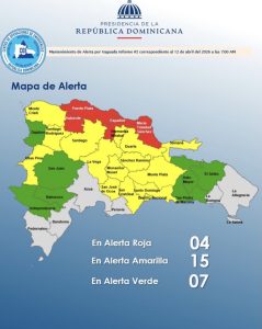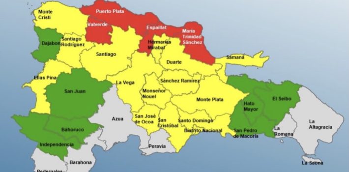 Mientras que en alerta verde están Hato Mayor, El Seibo, Dajabón, Independencia, Bahoruco, San Pedro de Macorís y San Juan.