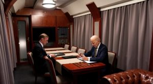 Biden se dirigió a la embajada de Estados Unidos para una breve parada antes de partir del país en tren de regreso a Polonia a bordo de un vagón bien equipado, con paneles de madera, cortinas bien cerradas, una mesa de comedor y un sofá de cuero.