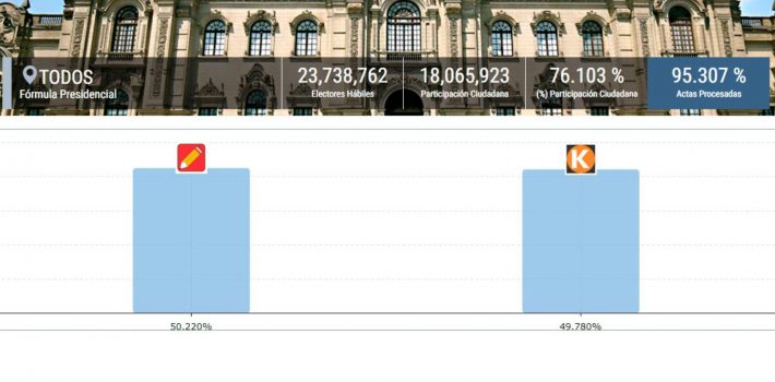 Lima, (ANDINA),-El candidato de Perú Libre, Pedro Castillo, obtiene el 50.220% de la votación nacional, seguido por Keiko Fujimori de Fuerza Popular, con 49.780%, al 95.307% de las actas procesadas por la Oficina Nacional de Procesos Electorales (ONPE).