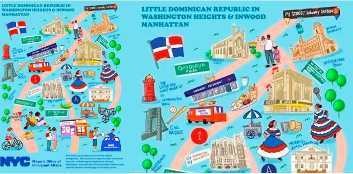 La ilustración de «Little Dominican Republic», expone áreas comerciales, algunas plazas, teatros y negocios.