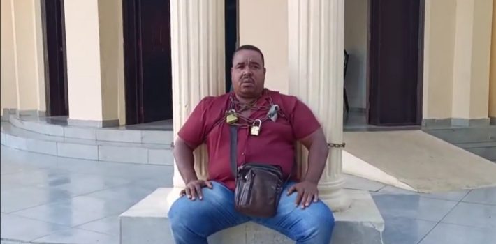 Dajabón,- Un comerciante que denunció haber sido detenido de manera irregular por militares optó por encadenarse frente a la gobernación local.