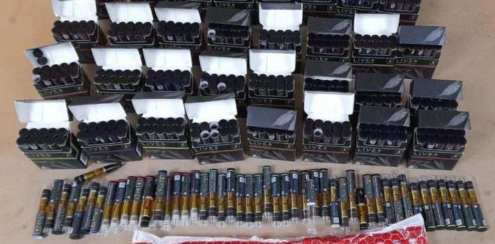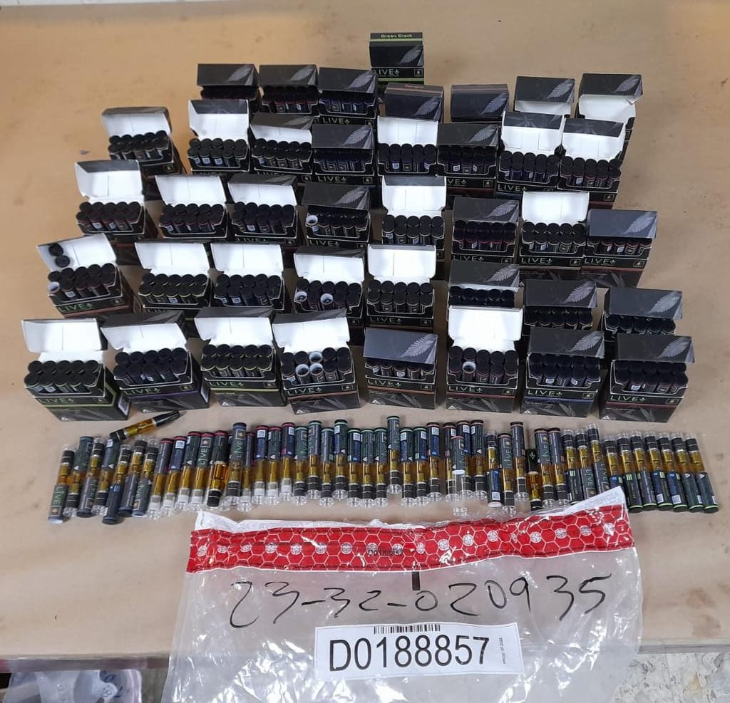 Además se incautaron 36 envases plásticos, cigarrillos electrónicos, varias porciones del vegetal y 600 cartuchos rellenos de marihuana líquida.