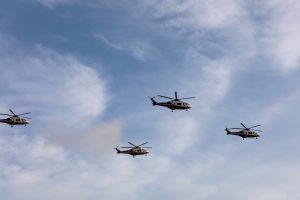 Mientras, unidades de la aeronave TP-75 Dulus, ensamblada en la Fuerza Aérea de República Dominicana, surcaban los cielos junto a los Super Tucano, para anunciar la entrada de los miembros del Ejército del Aire al desfile, escoltados por helicópteros utilizados para operaciones especiales.