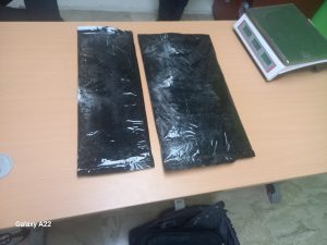 En presencia del detenido y por instrucciones del fiscal, se abrió el equipaje, descubriendo un doble fondo, en cuyo interior se ocuparon las dos láminas, envueltas en fundas plasticas de color negro, con un peso superior a los dos (02) kilogramos.