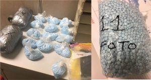 La policía buscó en un área de almacenamiento de la segunda planta de la tienda y encontraron 14.000 pequeñas píldoras azules estampadas con el sello “M30”, marca que identifica a la oxicodona y dos ladrillos de heroína con un peso de más de cuatro libras.
