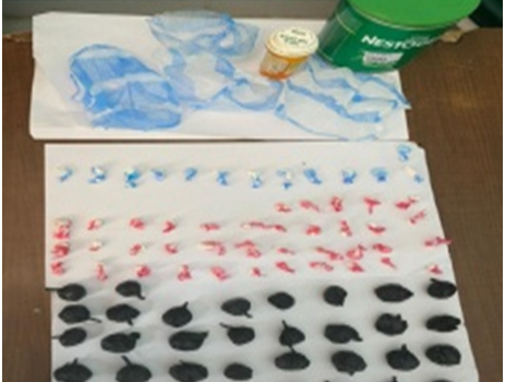Al momento de su arresto, agentes preventivos y de investigaciones criminales de la Policia Nacional le ocuparon 34 porciones de un vegetal verde, 38 porciones de un material rocoso y otras 13 porciones de un polvo blanco.