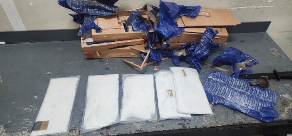 En presencia de un fiscal se procedió a sacar las cajas de madera, descubriendo en lados y parte baja, un doble fondo con cinco paquetes (en forma de láminas), envueltos en papel carbón, con un peso de 1.07 kilogramos.