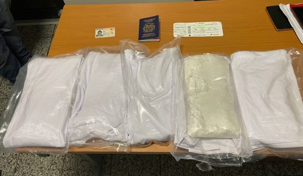 Los agentes antinarcóticos, militares y miembros de agencias de inteligencia destacados en la terminal, detuvieron en el área de chequeo a una joven de 22 años, que intentó llevar en su equipaje los cinco paquetes de la sustancia a Madrid, España.