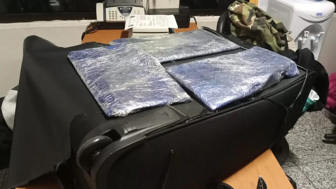 Luego y en presencia de un fiscal adjunto, se descubrió un doble fondo, en el equipaje, donde se ocuparon tres láminas de una sustancia que aparenta ser cocaína, envueltas en papel de carbón azul, con un peso preliminar de 2.33 kilogramos.