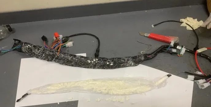 Posteriormente, en presencia de un fiscal adjunto se procedió a abrir la caja, ocupando en su interior un ramal eléctrico y dos catres de motocicletas rellenos de cocaína, con un peso preliminar de 890 gramos.