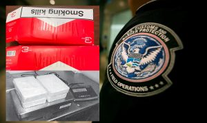 Durante una revisión de las bolsas agentes de la Patrulla Fronteriza y Protección de Aduanas (CBP) de Estados Unidos encontraron los cuatro ladrillos de cocaína envueltos en plástico ocultos dentro de los cartones de los cigarrillos.