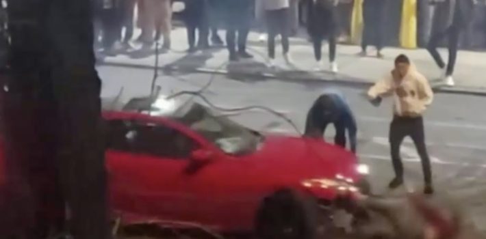 La multitud reacciona con horror cuando el auto lo atropella, antes de que la gente se disperse rápidamente.